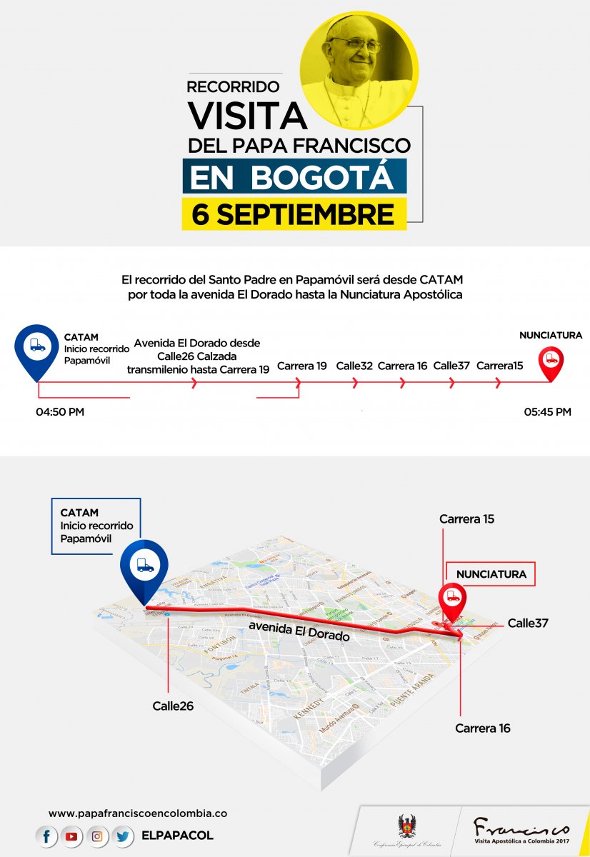 Tras su llegada a la capital del país, el Papa Francisco se desplazará desde CATAM por toda la Avenida El Dorado hasta la Nunciatura Apostólica. Durante su recorrido pasará por la calzada de Transmilenio hasta la Carrera 19, Calle 32, Carrera 16, Calle 37 y Carrera 15 hasta la Nunciatura.