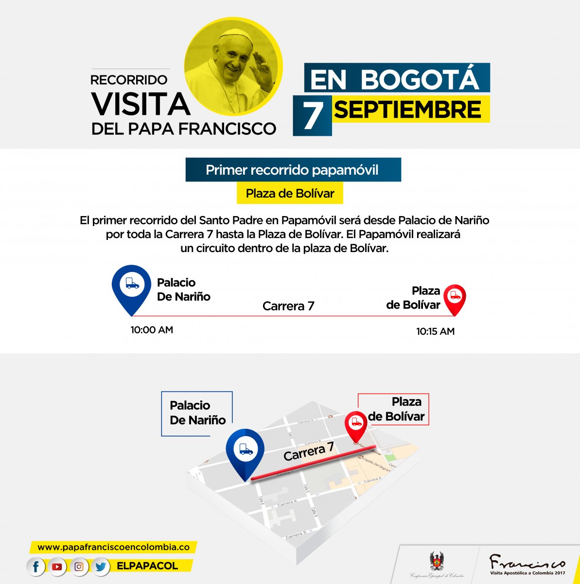 El primer recorrido del día en Papamóvil será desde la Casa de Nariño por la Carrera Séptima hasta la Plaza de Bolívar. Luego Santo Padre realizará un circuito dentro de la Plaza de Bolívar.