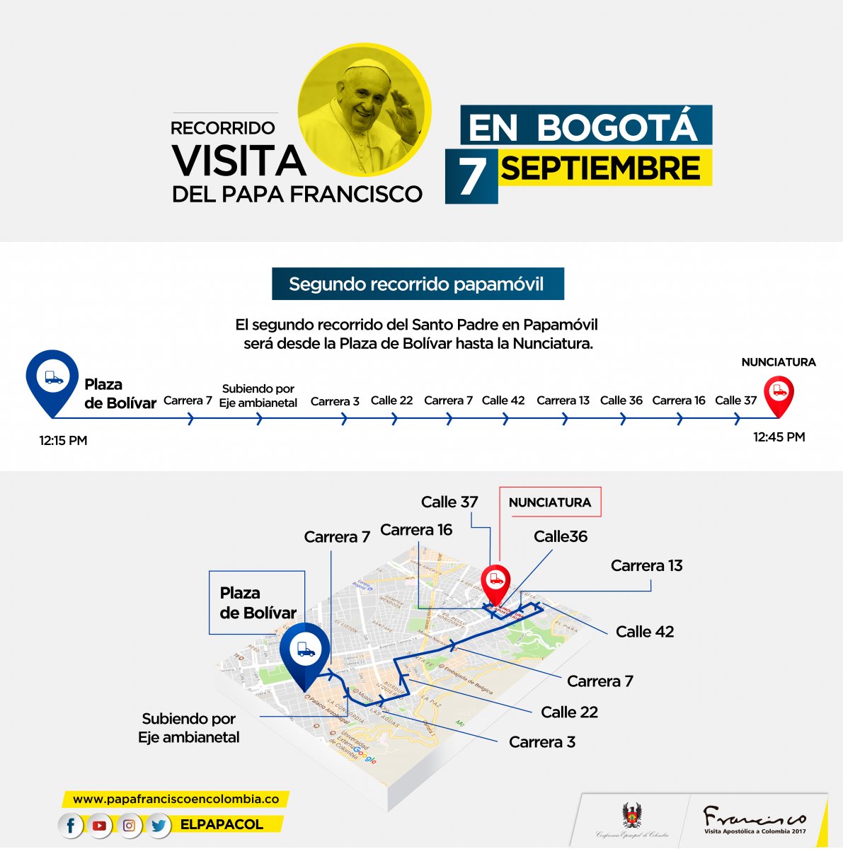 A las 12:15 pm, el Sumo Pontífice partirá desde la Plaza de Bolívar rumbo a la Nunciatura. Transitará por la Carrera Séptima subiendo por el Eje Ambiental, luego tomará la Carrera 3, la Calle 22, Carrera Séptima, Calle 41, Carrera 13, Calle 36, Carrera 16, Calle 37, terminando su recorrido en la Nunciatura.