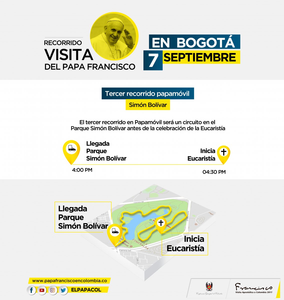 Este recorrido corresponde a un circuito que se cumplirá desde la entrada al Parque Simón Bolívar hasta el punto donde se llevará a cabo la Santa Misa.