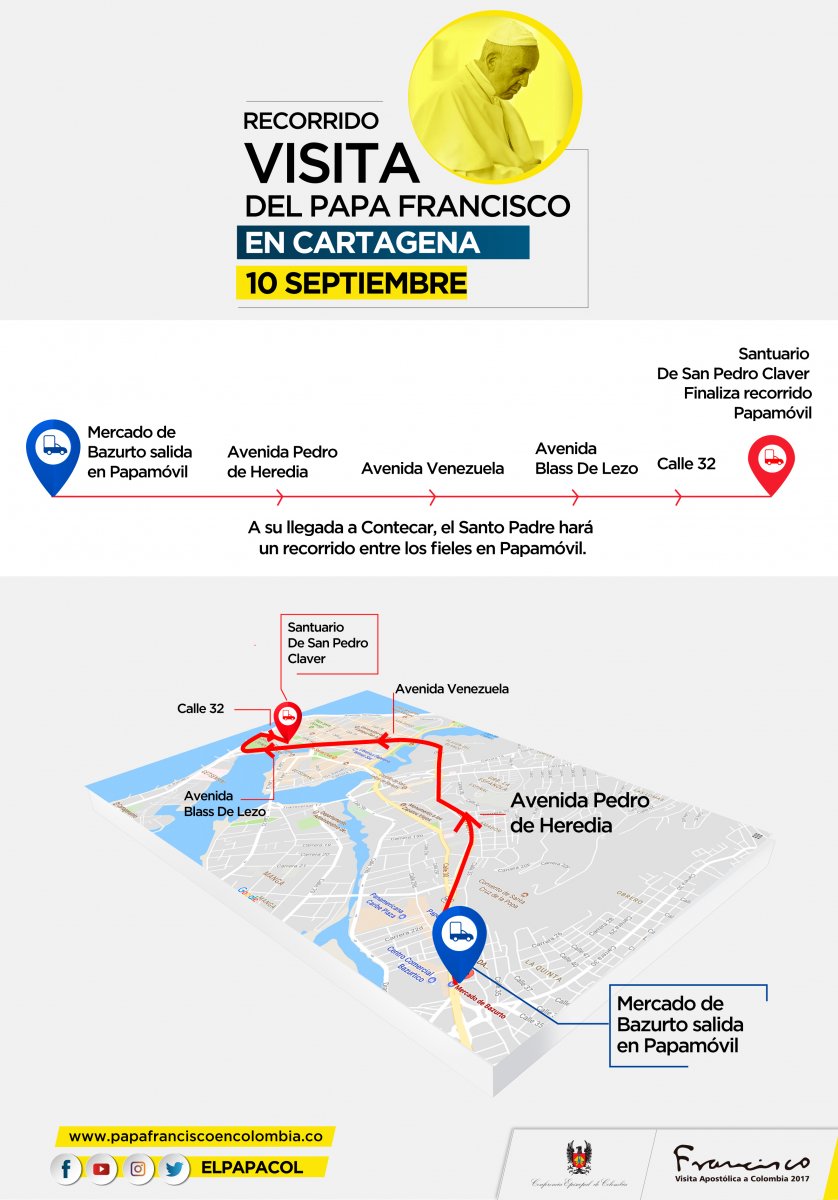 Luego de su llegada a la capital de Bolívar, el Sumo Pontífice hará un recorrido desde el mercado de Bazurto, pasando por las Avenidas Pedro de Heredia, Venezuela y Blass De Lezo. Tomará la calle 32 y llegará al Santuario de San Pedro Claver.