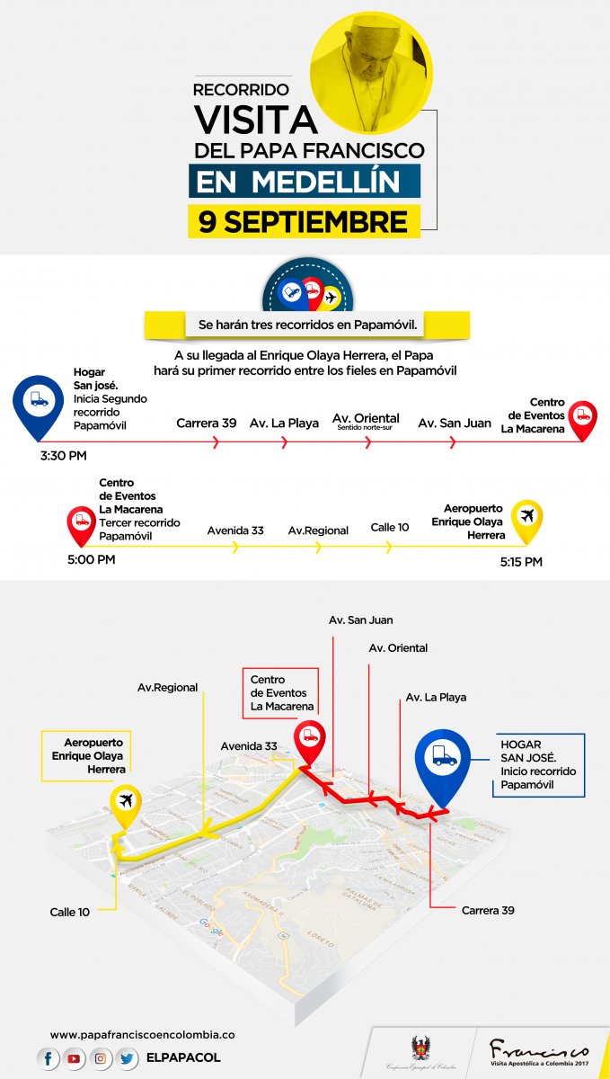El Papa Francisco partirá a las 5 de la tarde del Centro de Eventos La Macarena, transitará por la Avenida 33, la Avenida Regional, la Calle 10 hasta el Aeropuerto Enrique Olaya Herrera, donde abordará un helicóptero que lo llevará de regreso al Aeropuerto de Ríonegro.