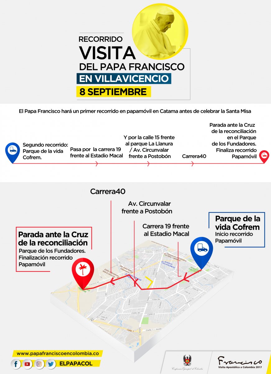 Luego, al salir del Parque de la Vida Cofrem, se desplazará también en Papamóvil hacia el Parque de Los Fundadores, donde será la Parada ante la Cruz de la Reconciliación. Durante este trayecto pasará por la carrera 19 frente al estadio Macal; por la calle 15 frente al Parque La Llanura/Avenida Circunvalar frente a Postobón y la Carrera 40.